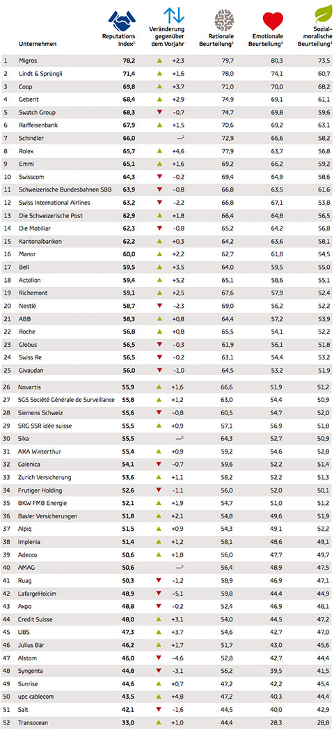 Wie bereits 2015 landet Lindt & Sprüngli auf Rang 2. Zum ersten Mal aufs Podest geschafft hat es Coop. Auch Geberit, Swatch, die Raiffeisenbank, Emmi und Swisscom konnten ihren Status als Top 10-Unternehmen im Ranking behaupten. Nicht mehr unter den zehn reputationsstärksten Unternehmen sind die Swiss International Airlines sowie die SBB.