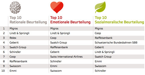 Migros steht wie in den beiden Vorjahren an der Spitze der 52 untersuchten Unternehmen auf allen drei Dimensionen, weist aber vor allem einen grossen Vorsprung hinsichtlich der emotionalen Bewertung auf.